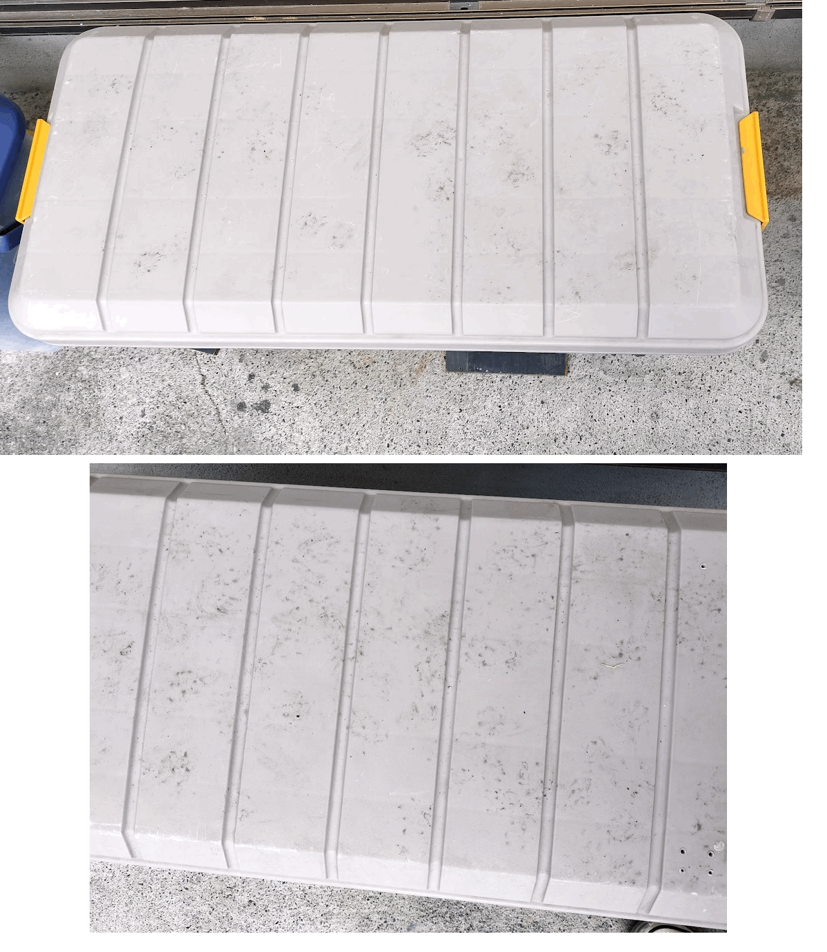 廊下の外に大きなストッカーを置いています。(竹山団地でレンタル菜園で使っていたものです。)ちょうどよい踏み台になっています。耐荷重70キロなのでw椅子代わりにもしています。なのでいつもきれいにしているのですが、今朝、見るとやたらに汚れています。