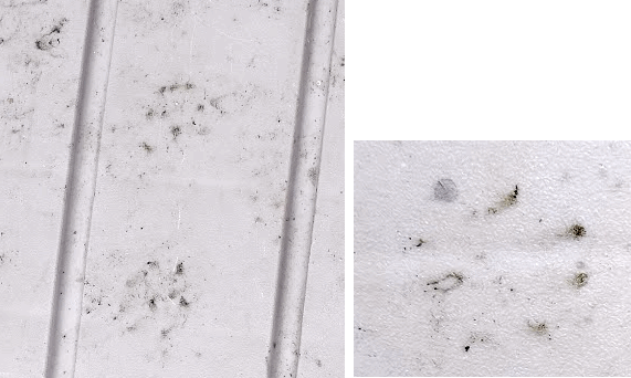 この汚れよう。雨の中誰かがやって来て、2つのストッカーの上を歩き回ったようです。