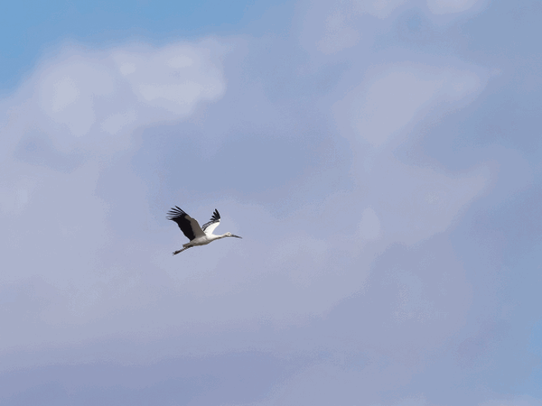 コウノトリ: 翼を広げた時、風切羽(翼の外側と後ろ側)が黒く、胴体や翼の前側は真っ白です。下から見上げると、白と黒のコントラストが非常に美しく、「端正」という表現がぴったり当てはまります。