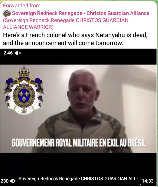 こちらのビデオはフランスの大佐で、ネタニヤフは死んでいると言っており、明日発表される予定だそうです。
