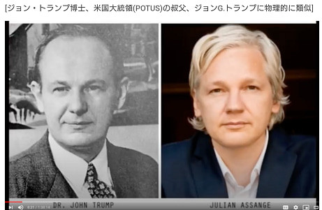 ※画像を検索していたら、ナントこんな画像を拾いました。(合成?と思うくらい酷似w)ジュリアン・アサンジ氏はWikiLeaks創始者。トランプ博士の子どもで、トランプ大統領の従兄弟の可能性がある?