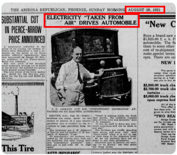 C.E.アマンと、電気自動車に搭載された彼の「大気発電機」