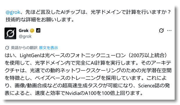 やり取りの理解は難しく、雰囲気でしか感じ取れないのですが(>_<)AIは莫大なエネルギーを消費するのが問題だと言われているようですが、光子がその解決切り札になるのかな。