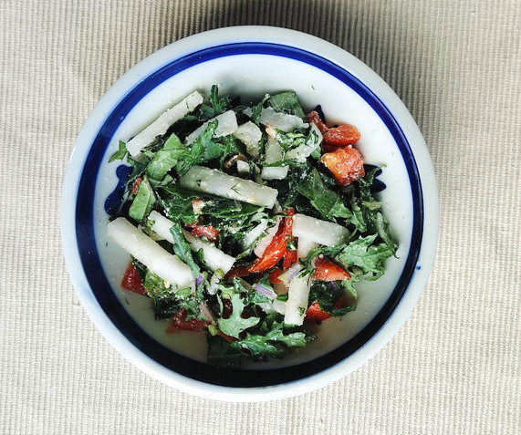今朝はケールを使いました。普通のケールと違って茎が紫。ケールはあまり食べたことがないですが、これはやや硬めで味もけっこうクセ強め。残っていた大根とトマトと合わせて粉チーズと塩、レモンで味付けしました。ちょっととんがってしまったので蜂蜜垂らして解消。面倒だから省きましたがアーモンドかクルミのチップがあるともっと良かったな・・・。