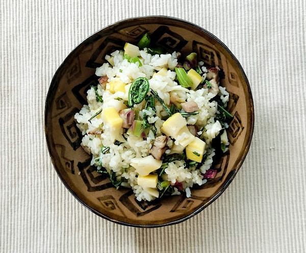 ベーコンとタケノコ、コゴミ、ほうれん草の根元付近をさっと炒めたチャーハンもどき。味付けは塩と、隠し味的に白だし。ちょっと物足りないくらいの塩加減が絶妙でグッドでしたぁ♪