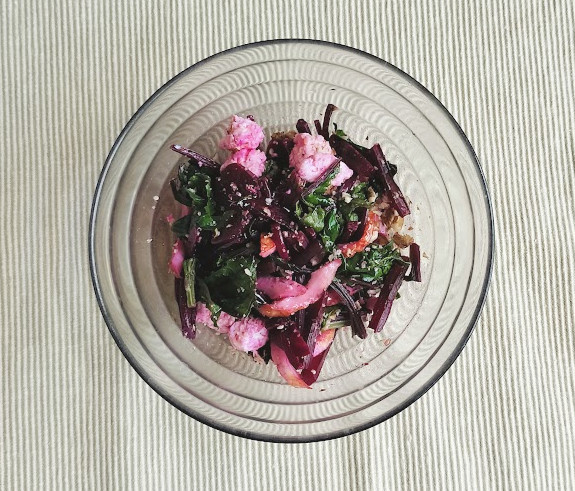 レシピに従って、まずは全部を軽く湯がいてサラダにしました。竹輪も入れました。白いのは花畑農場のクリームチーズのようなカッテージチーズw(このふたつの違いは何でしょうね)クルミを砕いてトッピング。これいい仕事してます。ビーツの茎の歯応えが堪らない。これ、美味しいですね。肝心の赤いカブ部分はよくわからない味でしたが(>_<)食感はグッド。たしかにいささか泥臭さはありますね。