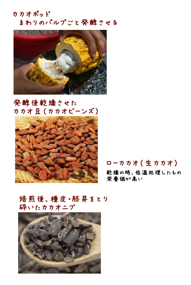 有機カカオの低温乾燥、非アルカリ化 これがもっとも加工度が低く栄養価が高いということになります。