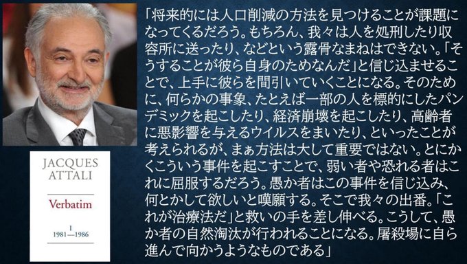 ここまであからさまに公言していました。アタリ以外にも、WEF(世界経済フォーラム)のシュワブ、ビル・ゲイツ、下っ端のハラリも同じ内容を著書で述べたり、講演でノベルなどしています。